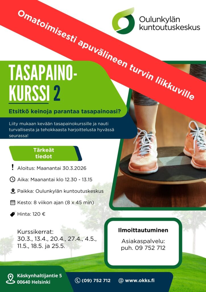 Maanantaina 30.3.2026 starttaa fysioterapeutin ohjaama tasapainokurssi, jossa tehdään monipuolisia tasapaino- ja liikkuvuusharjoitteita turvallisesti ja tehokkaasti.